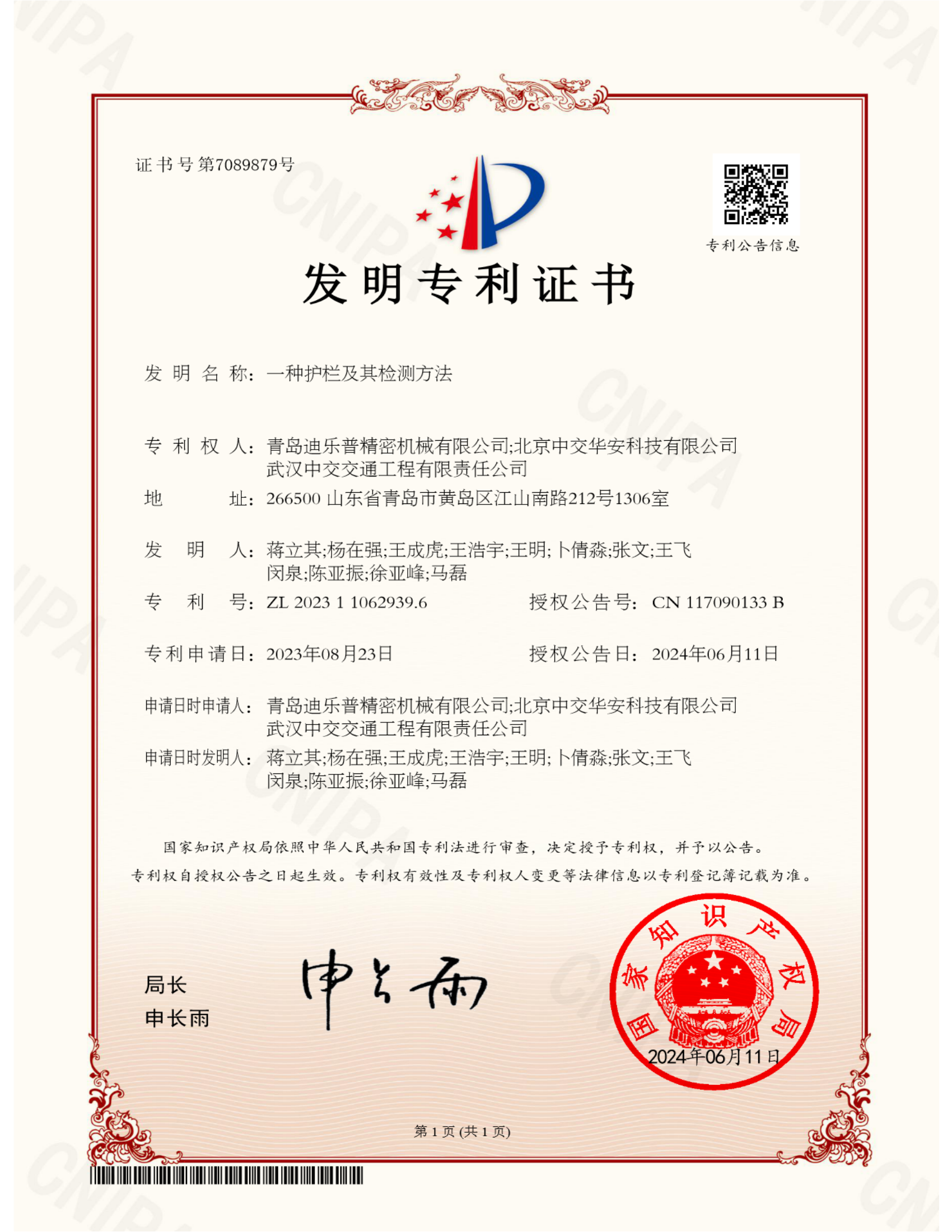 發(fā)明專利-一種護(hù)欄及檢測方法-證書_00
