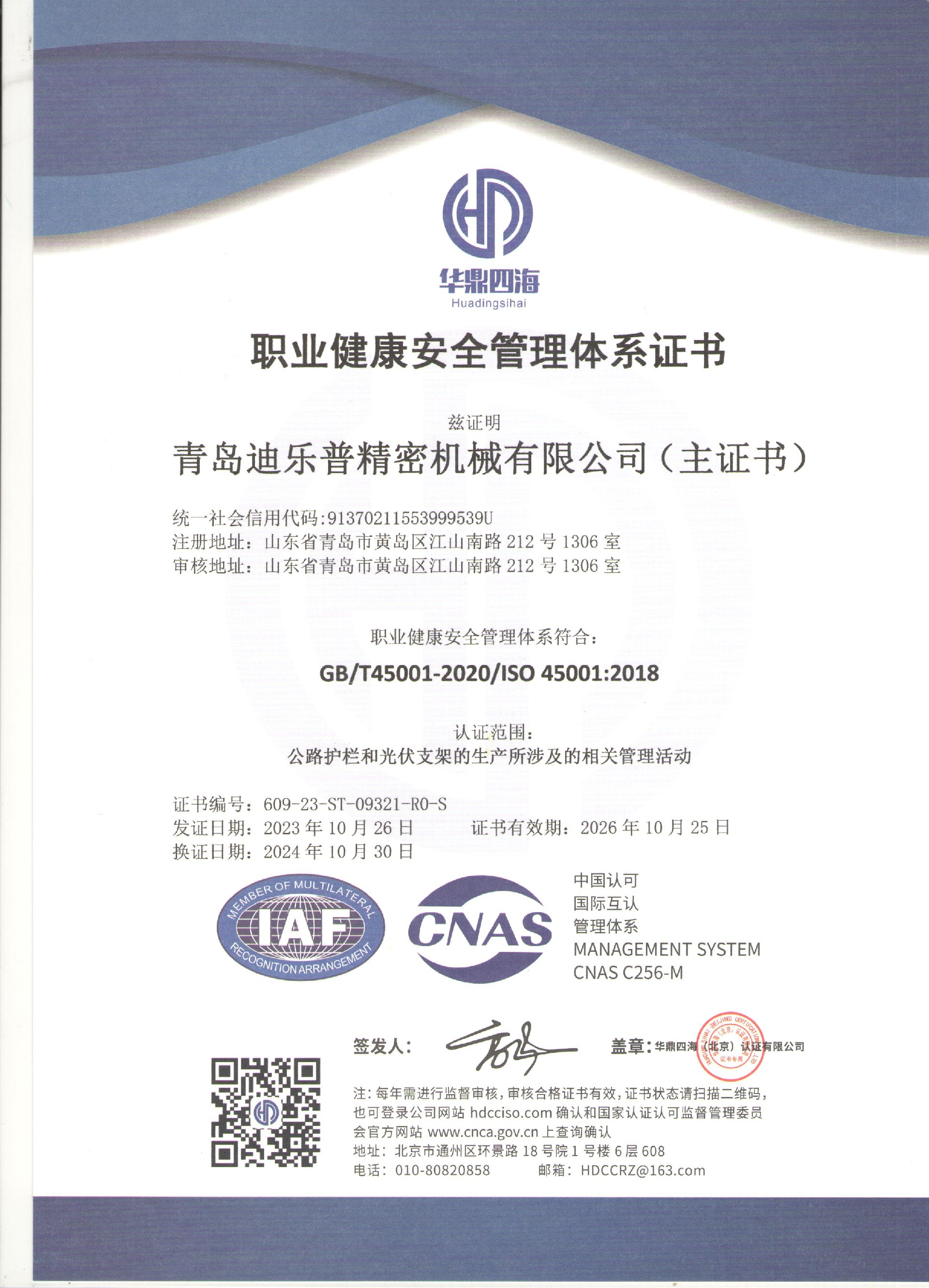 青島迪樂普-職業(yè)健康安全管理體系證書