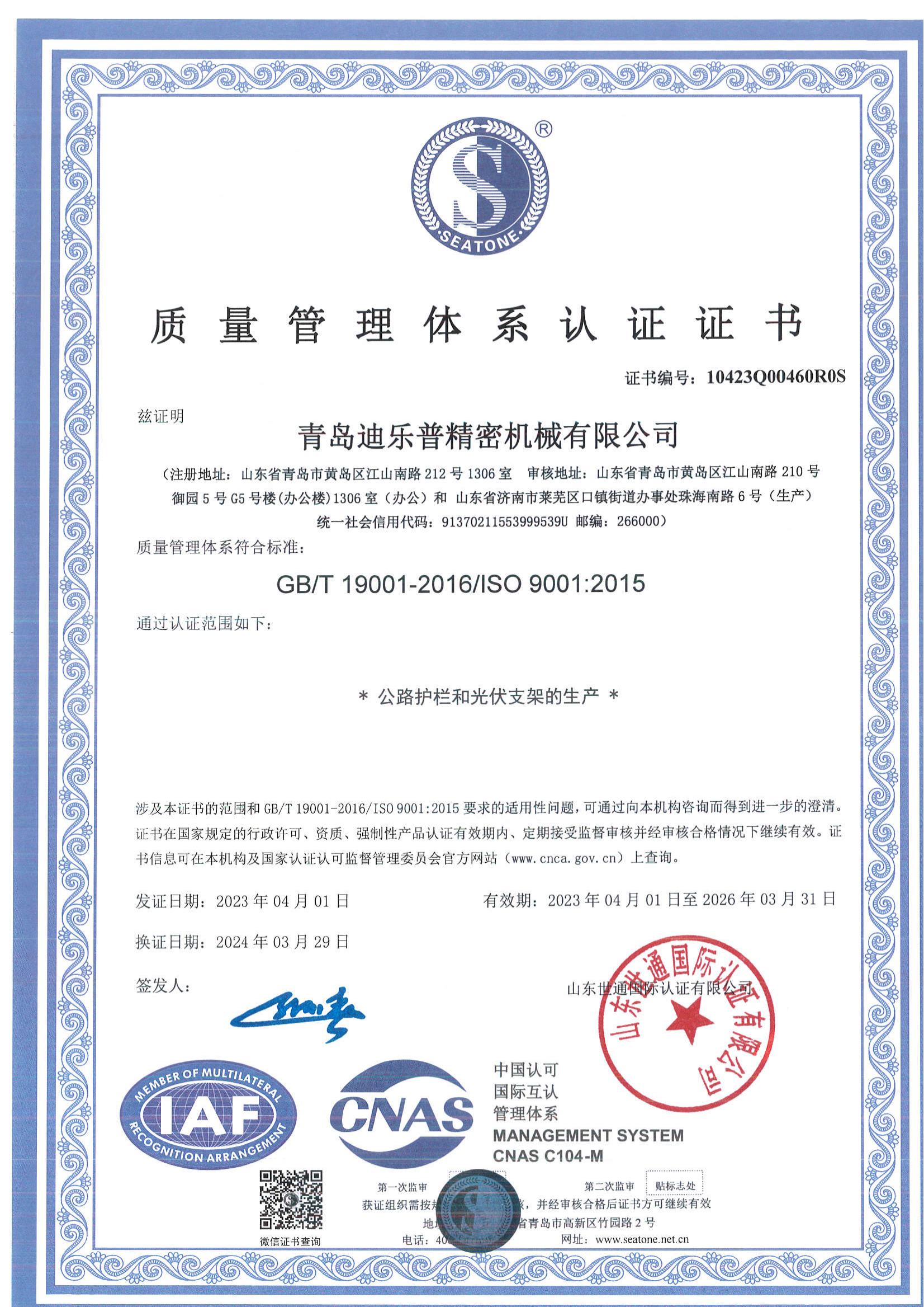 青島迪樂普--質(zhì)量管理體系證書